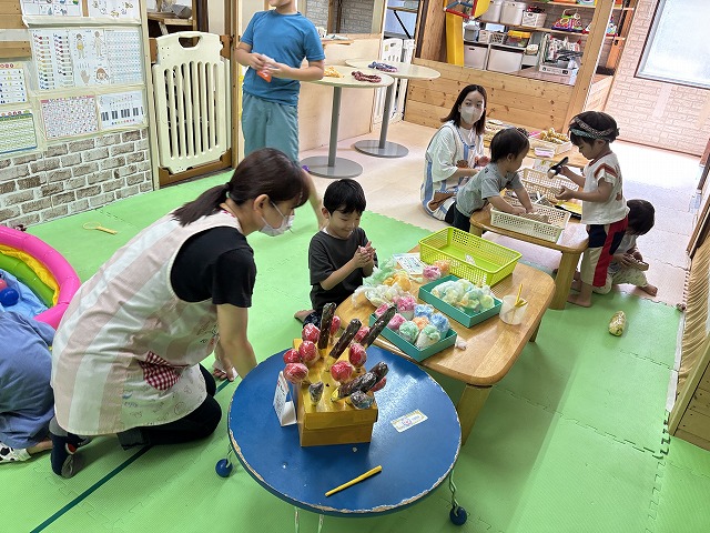 今日は八百屋さんでお買い物ごっこをしました!先日製作した人参・大根・トマト・きゅうり・レタス・茄子などをお店に並べて可愛い店員さんたちが「いらっしゃいませ~♪」お客様たちは、「今日のごはんは何にしようかな?」とお話ししながら買い物かごにいっぱい野菜を入れてレジ前に順番を守ってかっこよく並んでいましたよ♪お財布からお金を取り出しお釣りをもらったり、レジ操作や袋詰めなどなかなかの手際のよさにビックリでした♪可愛い店員さんとお客様たちで店内は大賑わいでした(*^▽^*)