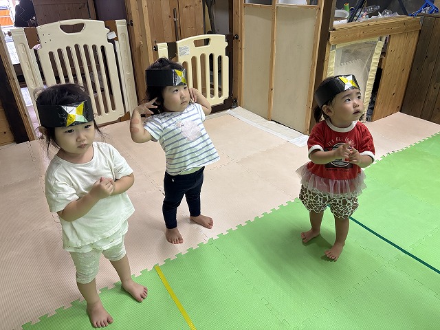 今日は忍者ごっこをしました!さぁ忍者の修行をはじめるよ~音をたてずに忍び足!ほふく前進にバランスボードも落ちないように上手に渡れるぞ!!”まじめ忍者”や”ゆびにんぽう”のダンスもはりきって踊ってくれましたよ♪みごとでござるぅ~にんにん!