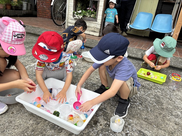 今日はプチ水あそびをしました!ペットボトルタワーやコップタワーに水を流したり、水鉄砲で的当て!スポンジに水をふくませて水の感触や流れをみて楽しみました♪プールでのおもいっきり水あそびとまた違ったあそびに夢中になっていたみんなでした♪